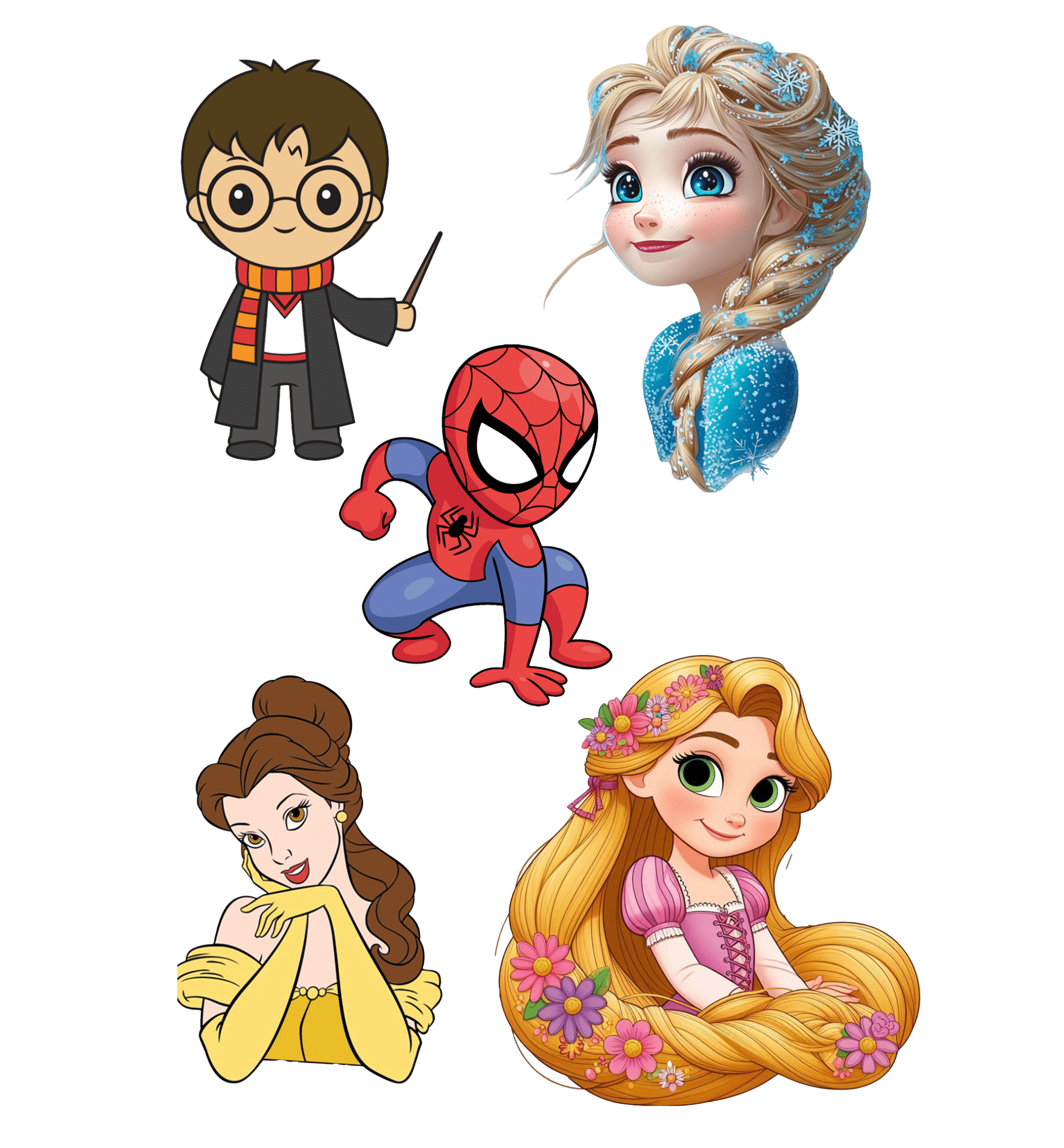We do Spiderman, Elsa, Rapunzel, Belle, Harry Potter, Halloween Witch & Christmas Elf, when available.